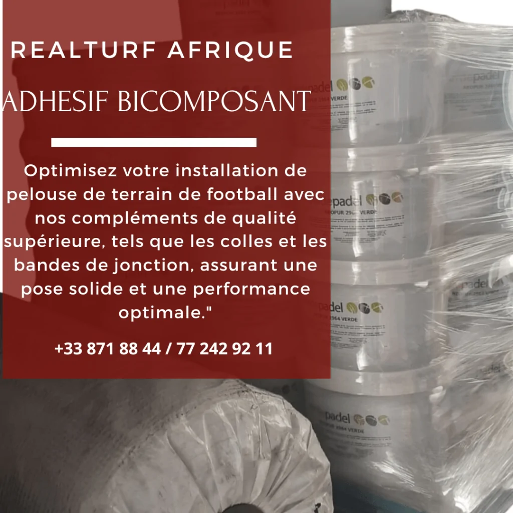 Realturf Afrique propose un adhésif bicomposant de qualité supérieure pour coller le gazon des terrains de football au Sénégal. Notre adhésif assure une adhérence fiable, résistante aux intempéries et à l’usure, pour une surface de jeu sûre et durable. En plus de l’adhésif, nous fournissons tous les accessoires nécessaires à l’installation complète de terrains de football professionnels, tels que des géotextiles, des bandes de jointure, des clous de fixation et des colles. Notre équipe expérimentée est là pour vous conseiller et vous guider tout au long du processus d’installation. Choisissez Realturf Afrique pour la qualité, la durabilité et l’excellence. Contactez-nous dès aujourd’hui pour en savoir plus sur notre adhésif bicomposant et nos accessoires. Faites confiance à notre expertise pour créer un terrain de football exceptionnel au Sénégal.